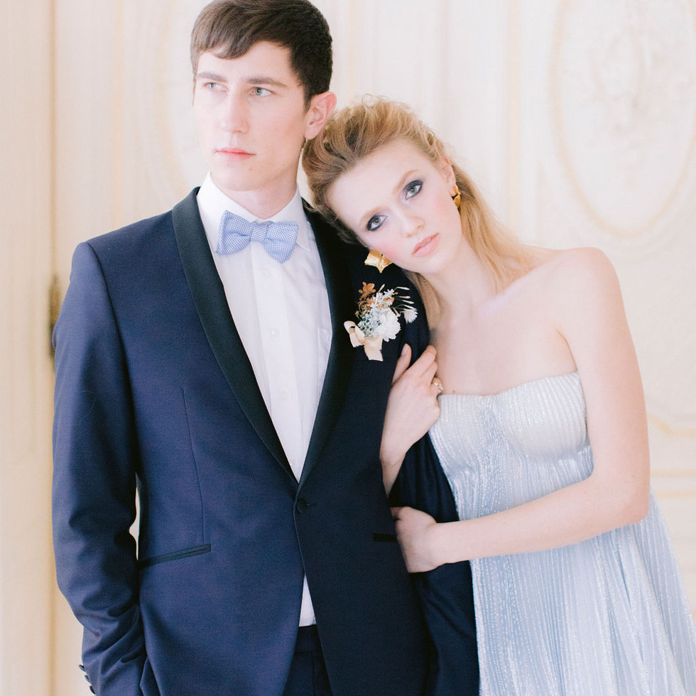 French inspired details + a chic blue wedding dress in this gold + blue editorial
